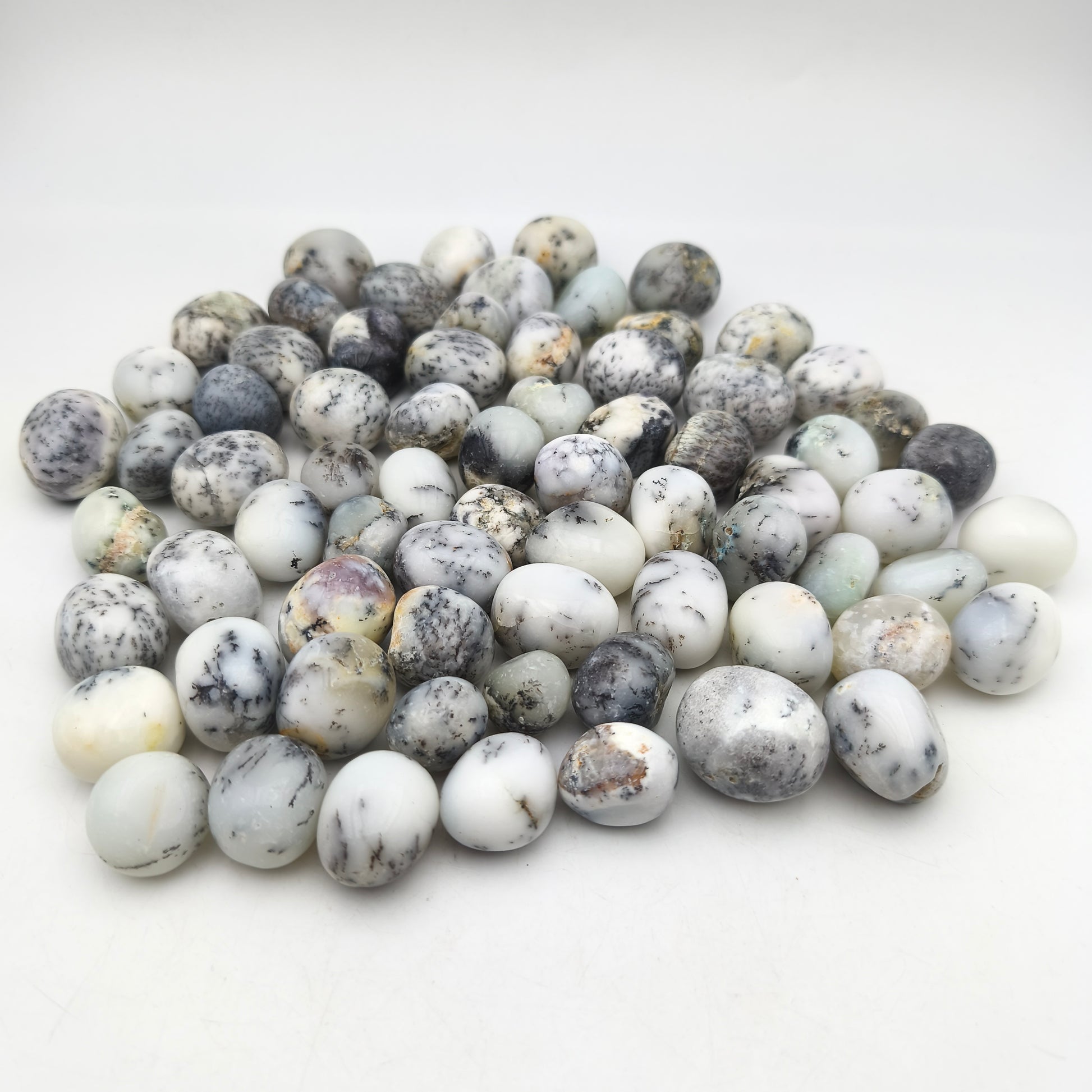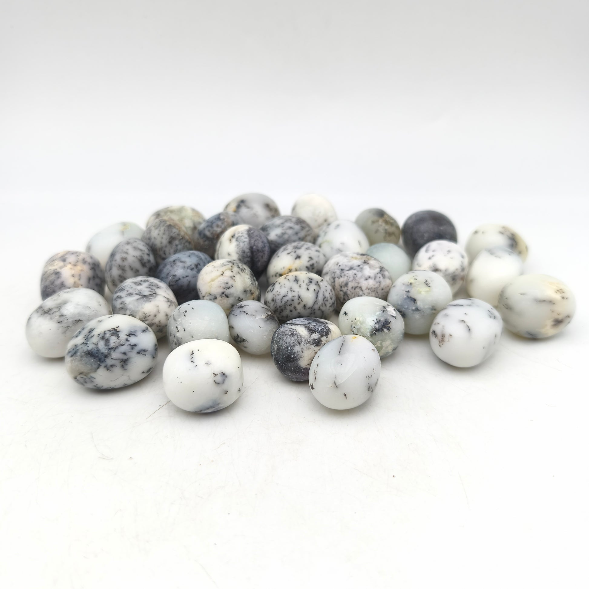L’Agate dendritique, également appelée Merlinite, est une pierre roulée naturelle reconnue pour ses motifs dendritiques noirs qui évoquent des branches ou racines, formant des paysages uniques au sein de la pierre. Cette pierre présente des nuances allant du blanc au gris, souvent avec une légère translucidité qui accentue les motifs végétaux caractéristiques. Chaque pièce, soigneusement polie, offre une finition lisse et une forme agréable en main, soulignant ainsi son aspect esthétique. Sa singularité visuelle en fait un produit apprécié tant pour la collection que pour la décoration ou la présentation en boutique. En tant que minéral naturel, l’Agate dendritique se distingue par son originalité et la variété de ses dessins, ce qui garantit qu’aucune pierre ne soit identique à une autre.