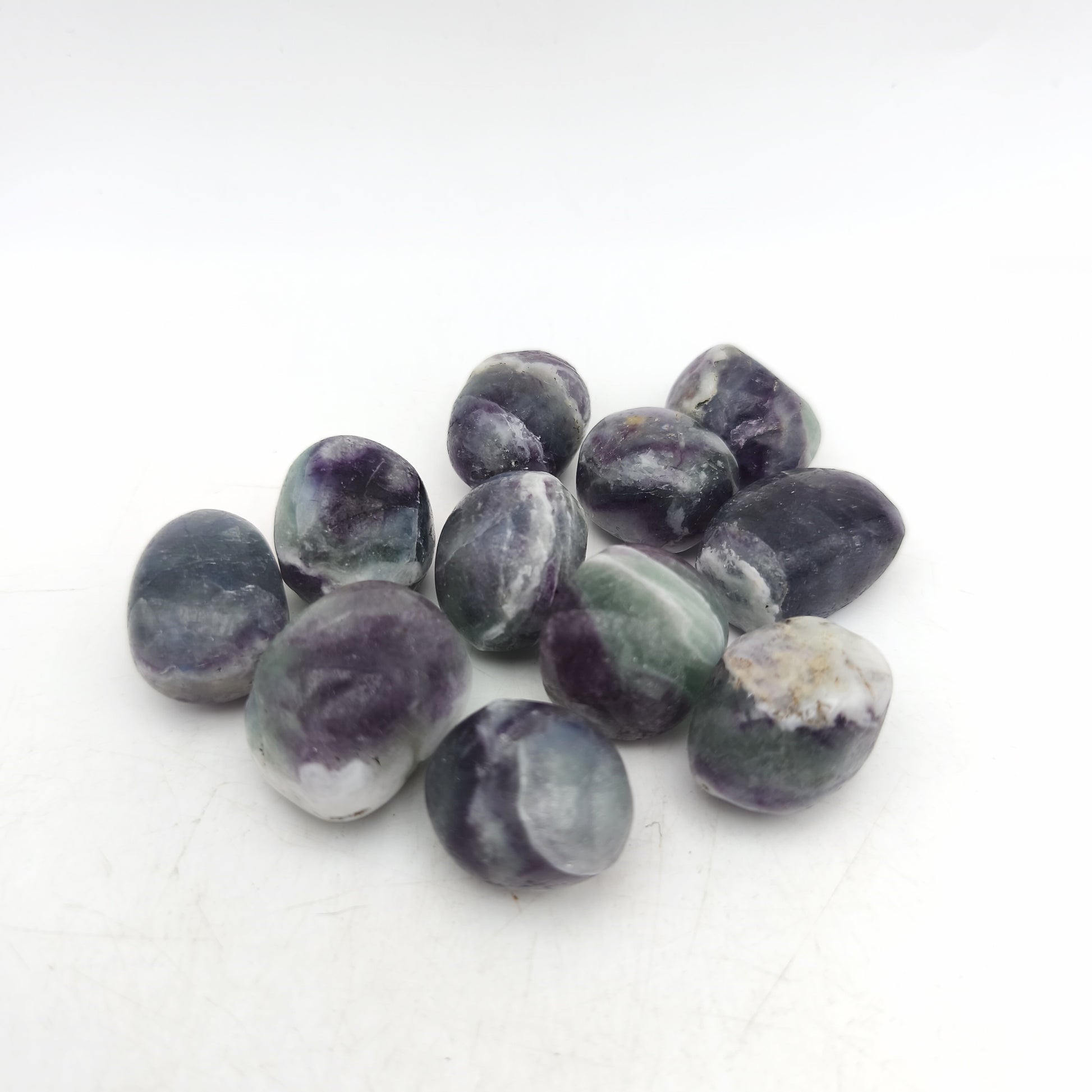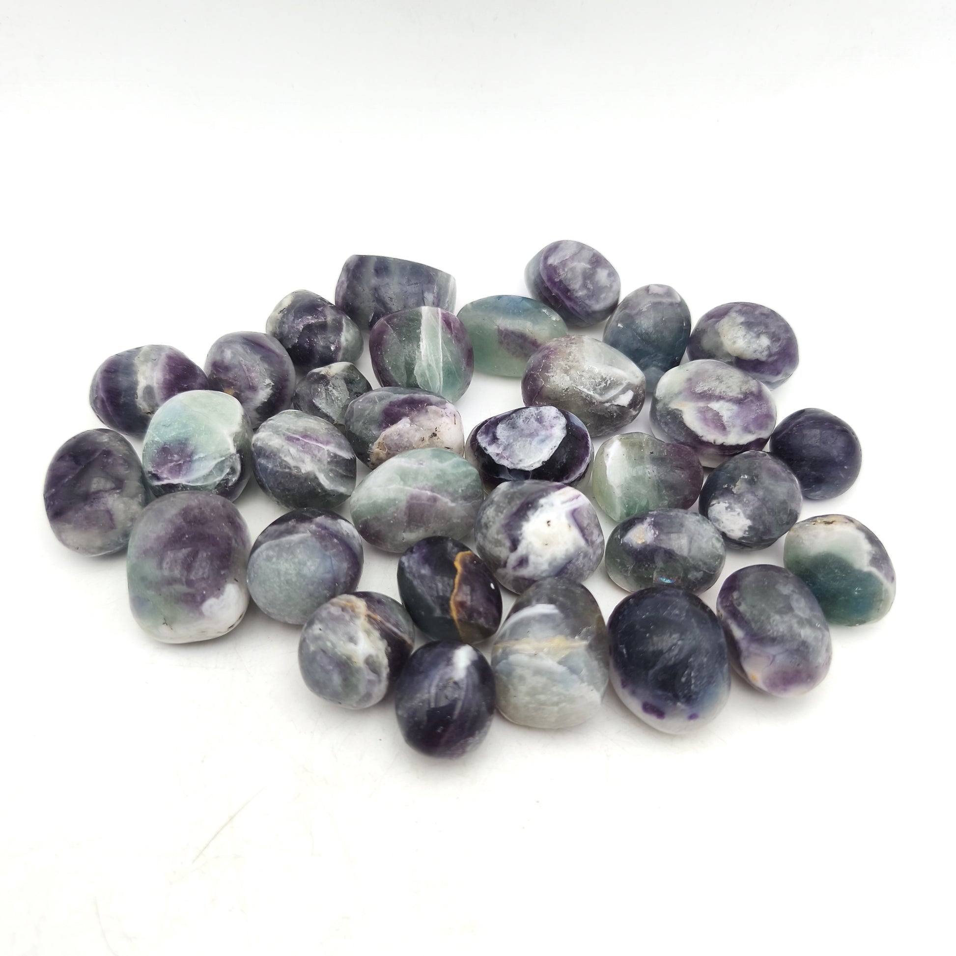 Ces pierres roulées en fluorite présentent une finition polie et lisse mettant en valeur la diversité de leurs couleurs naturelles. Chaque pièce révèle des nuances allant du violet au vert, parfois accompagnées de tons bleutés ou translucides selon les pierres. Les formes arrondies obtenues par roulage offrent un toucher agréable et une esthétique harmonieuse. Certaines pierres montrent des bandes de couleur nettes, tandis que d’autres présentent des transitions plus douces, caractéristiques de la fluorite. Leur translucidité partielle renforce l’éclat des couleurs et crée un rendu visuel lumineux et varié.