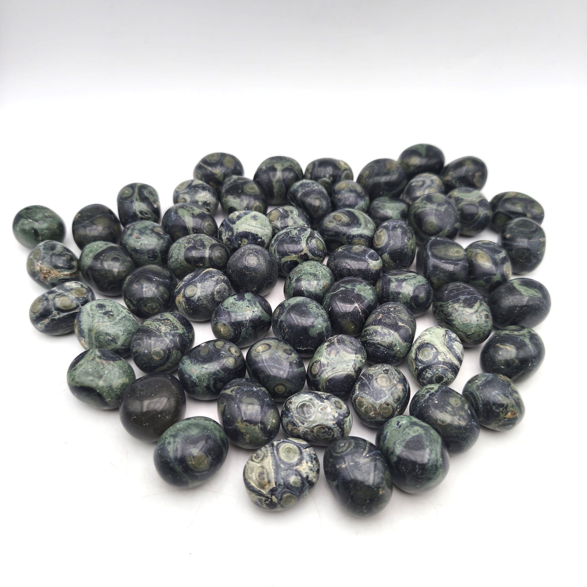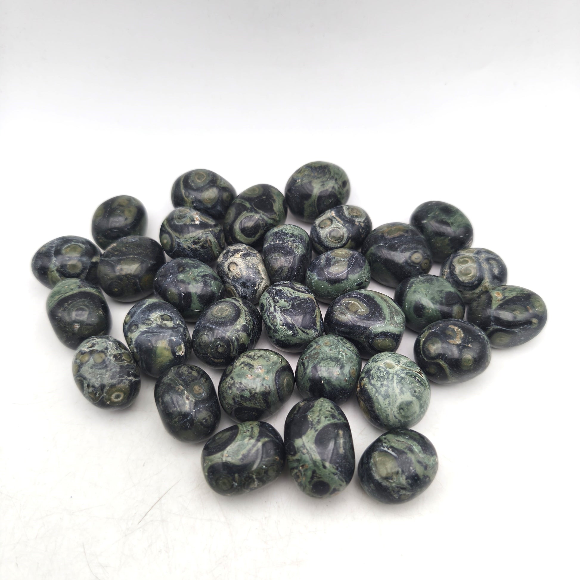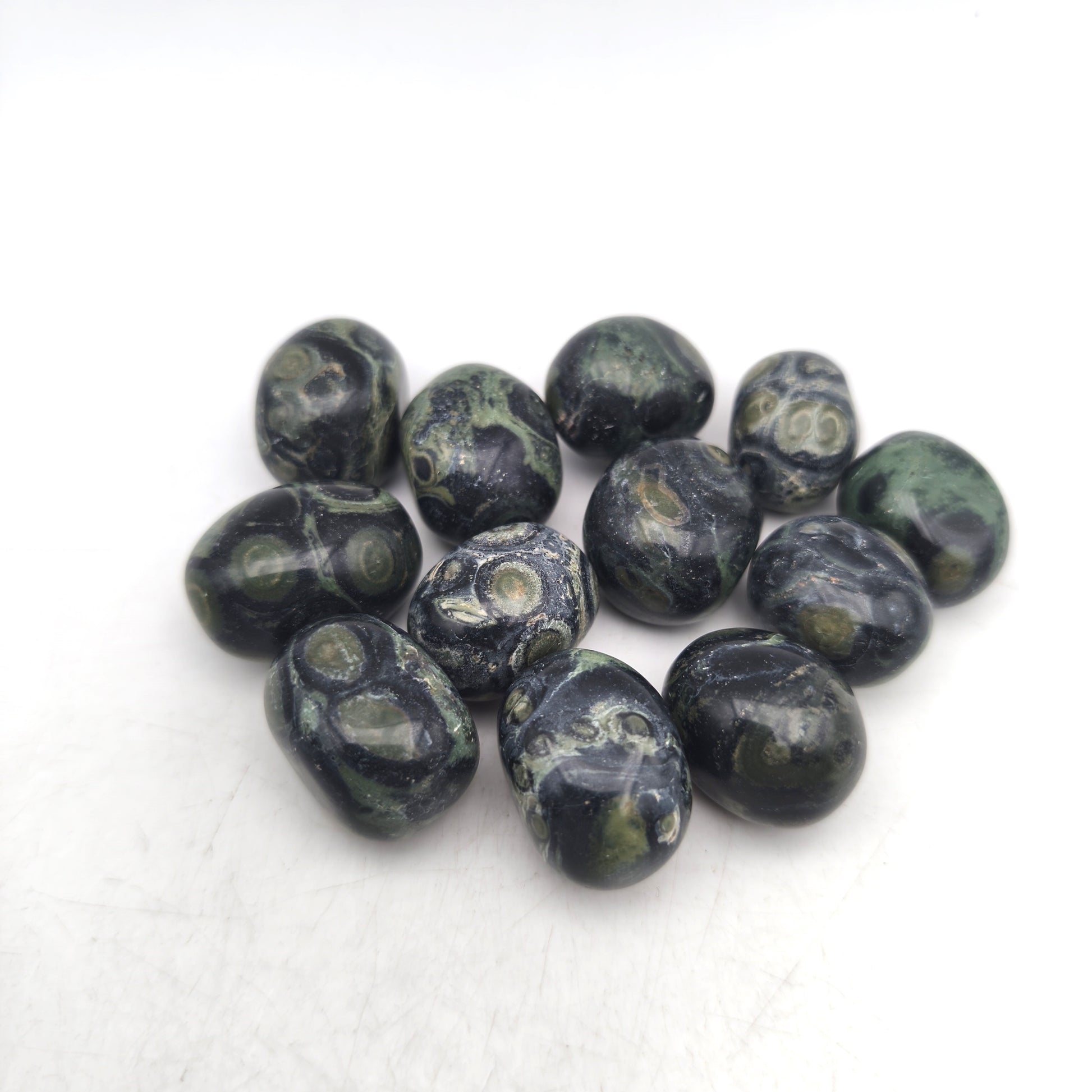 Ces pierres roulées en jaspe Kambaba présentent une finition polie et lisse qui met en valeur leurs motifs sombres caractéristiques. Chaque pierre révèle une combinaison de vert profond et de noir, formant des volutes, cercles et taches irrégulières typiques de cette variété de jaspe. Leur forme arrondie, obtenue par roulage, offre un toucher agréable et une apparence harmonieuse. Les nuances et dessins naturels varient d’un exemplaire à l’autre, certains présentant davantage de zones vertes tandis que d’autres affichent des motifs plus contrastés. Ces variations confèrent à chaque pierre une identité visuelle unique tout en conservant l’esthétique dense et organique propre au jaspe Kambaba.