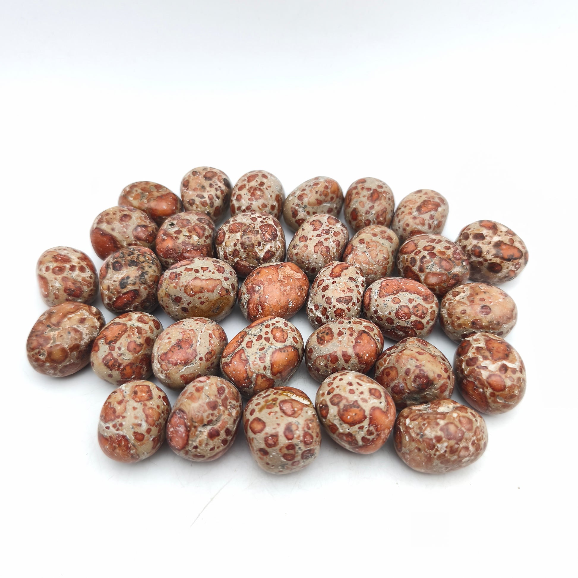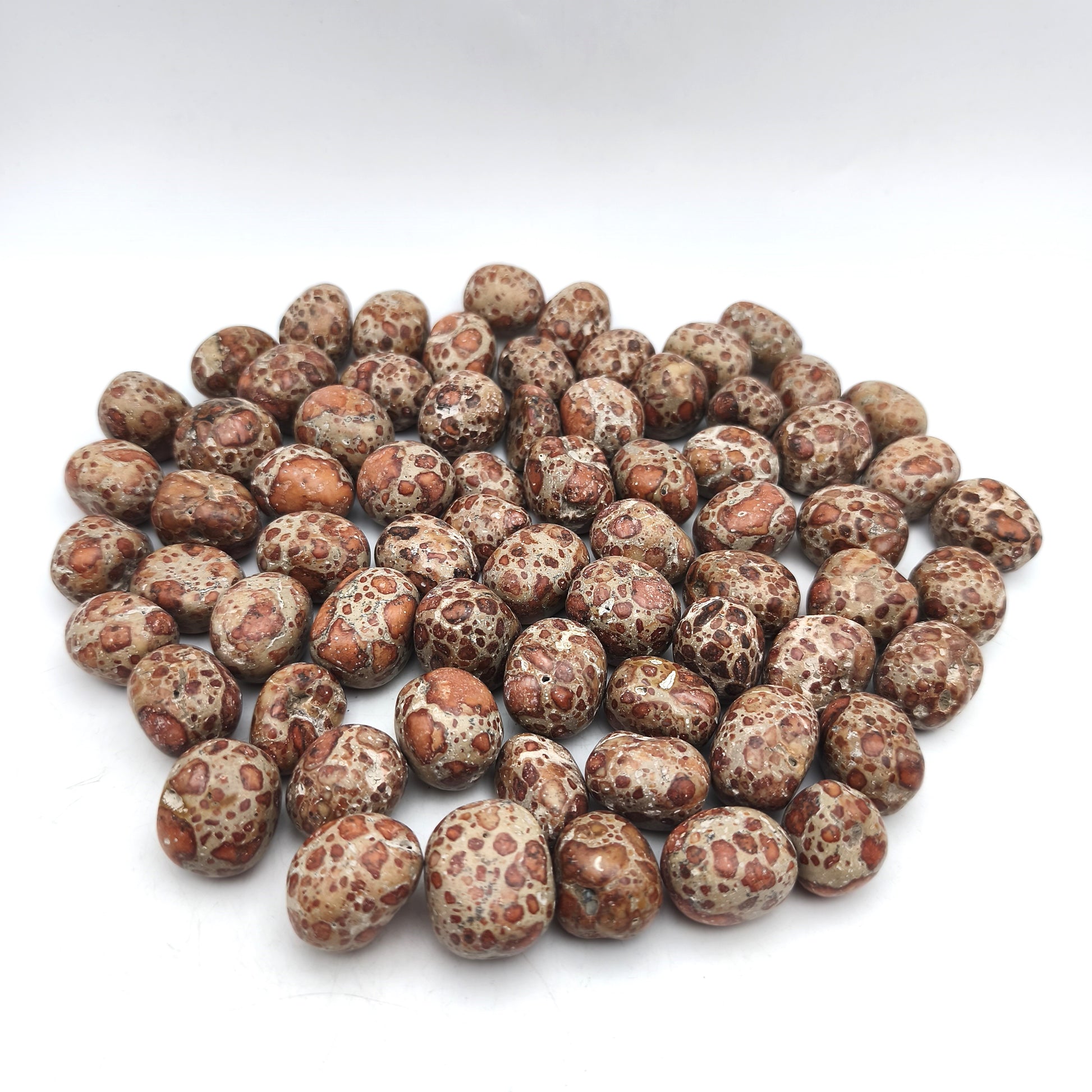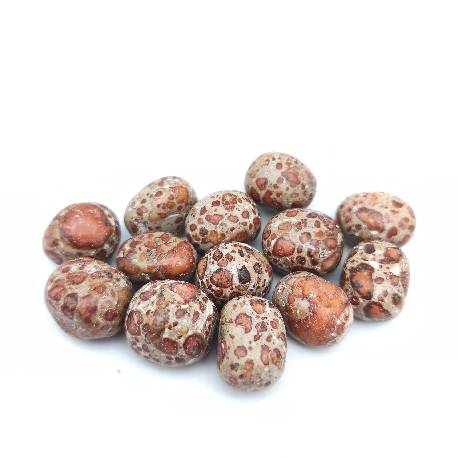 Ces pierres roulées en jaspe léopard présentent une finition polie et lisse qui met en valeur leurs motifs tachetés caractéristiques. Chaque pierre révèle une combinaison de teintes beiges, rosées, brunes ou rougeâtres, ponctuées de zones sombres formant des motifs évoquant la peau du léopard. Leur forme arrondie, obtenue par roulage, offre un toucher doux et une apparence harmonieuse. Les variations naturelles de couleurs et de dessins sont marquées : certaines pierres affichent des motifs circulaires nets, tandis que d’autres présentent des taches plus diffuses. Ces différences visuelles confèrent à chaque pierre une identité unique tout en conservant l’esthétique typique du jaspe léopard.