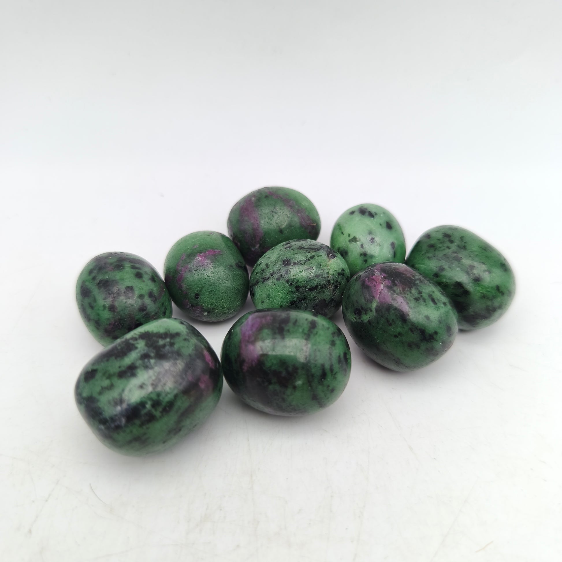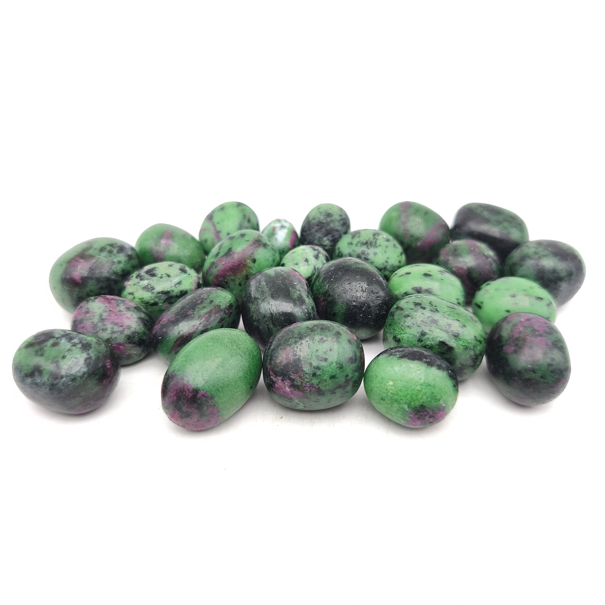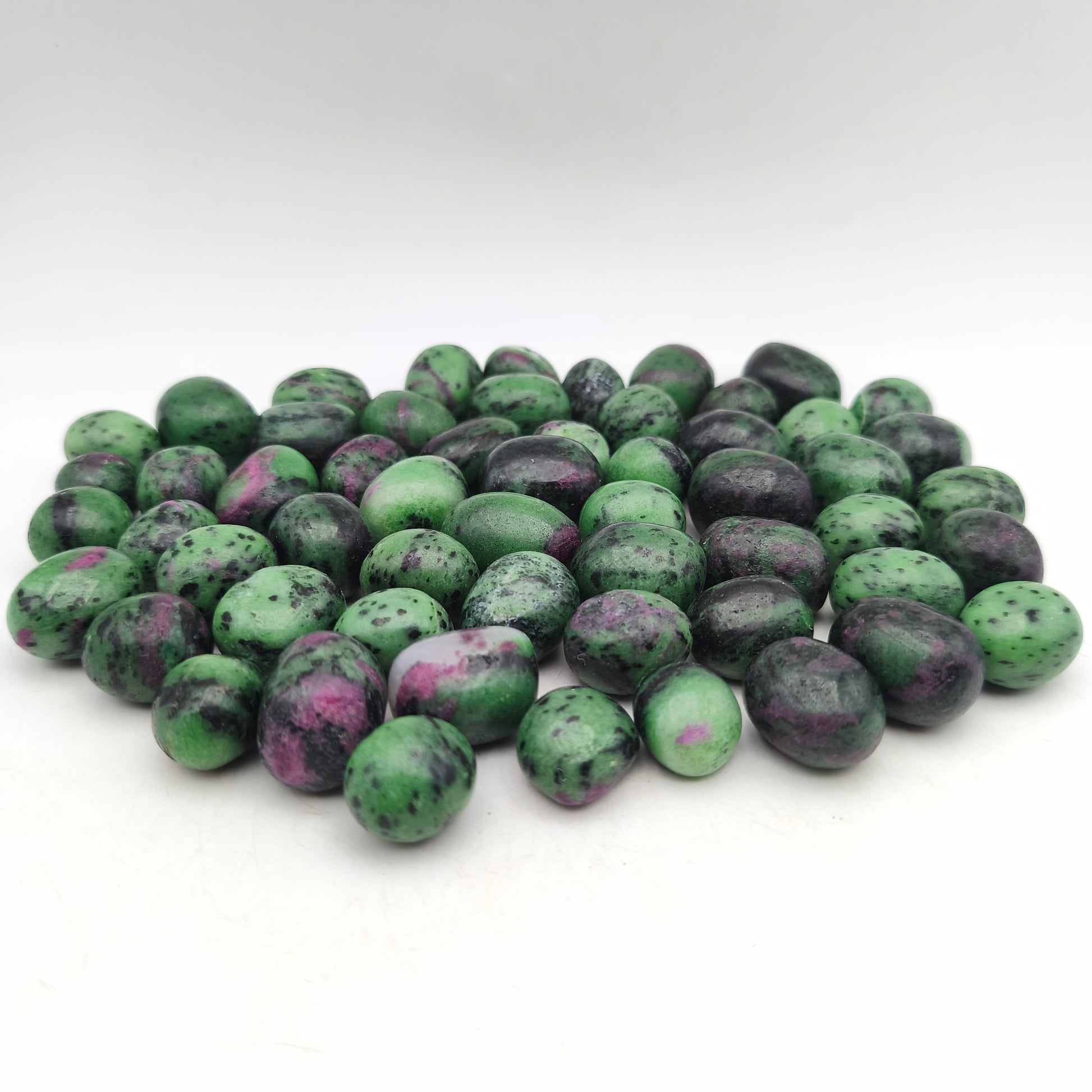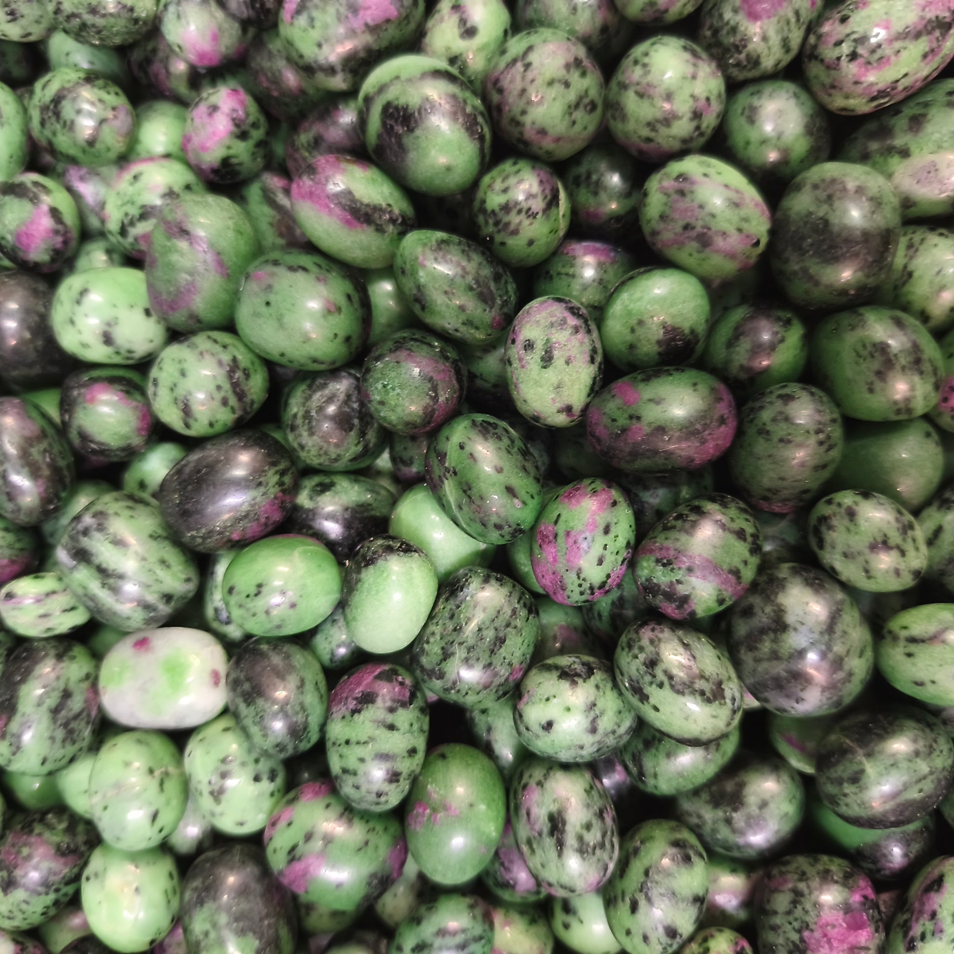 Ces pierres roulées en rubis zoïsite peuvent être utilisées en décoration, intégrées à une collection de minéraux ou employées dans des projets artisanaux nécessitant des pierres polies aux contrastes marqués. Leur association de couleurs vertes et rouges en fait des éléments visuels appréciés pour des compositions décoratives, des bols de pierres ou des présentoirs de minéraux.