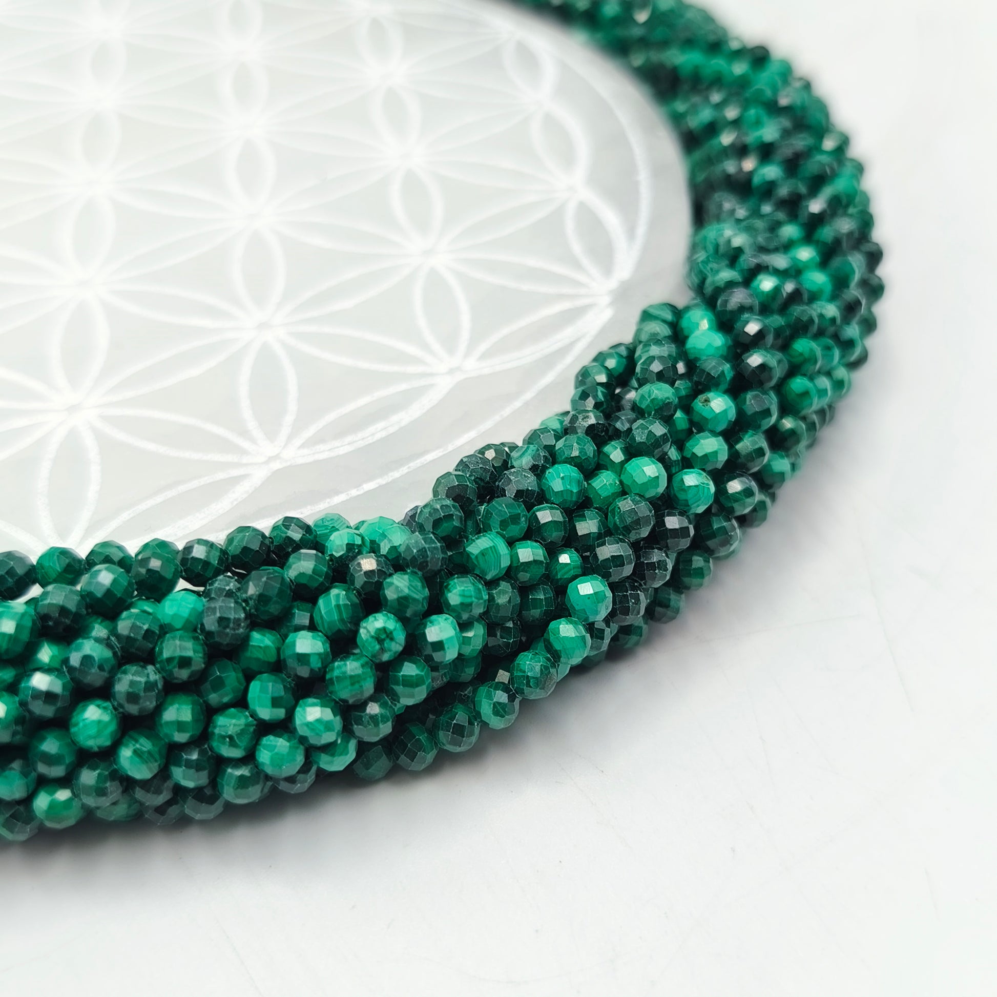 Ce rang de malachite facettée 4 mm proposé par Minéraux d’Ailleurs présente des perles aux teintes vertes intenses, marquées par des veinages naturels concentriques caractéristiques de la pierre. La taille facettée apporte un éclat supplémentaire en captant la lumière, offrant un rendu visuel lumineux et contrasté. Chaque perle est sélectionnée avec soin afin d’assurer une texture agréable, une bonne régularité et une présentation qualitative, répondant aux exigences des professionnels de la bijouterie et de la création.