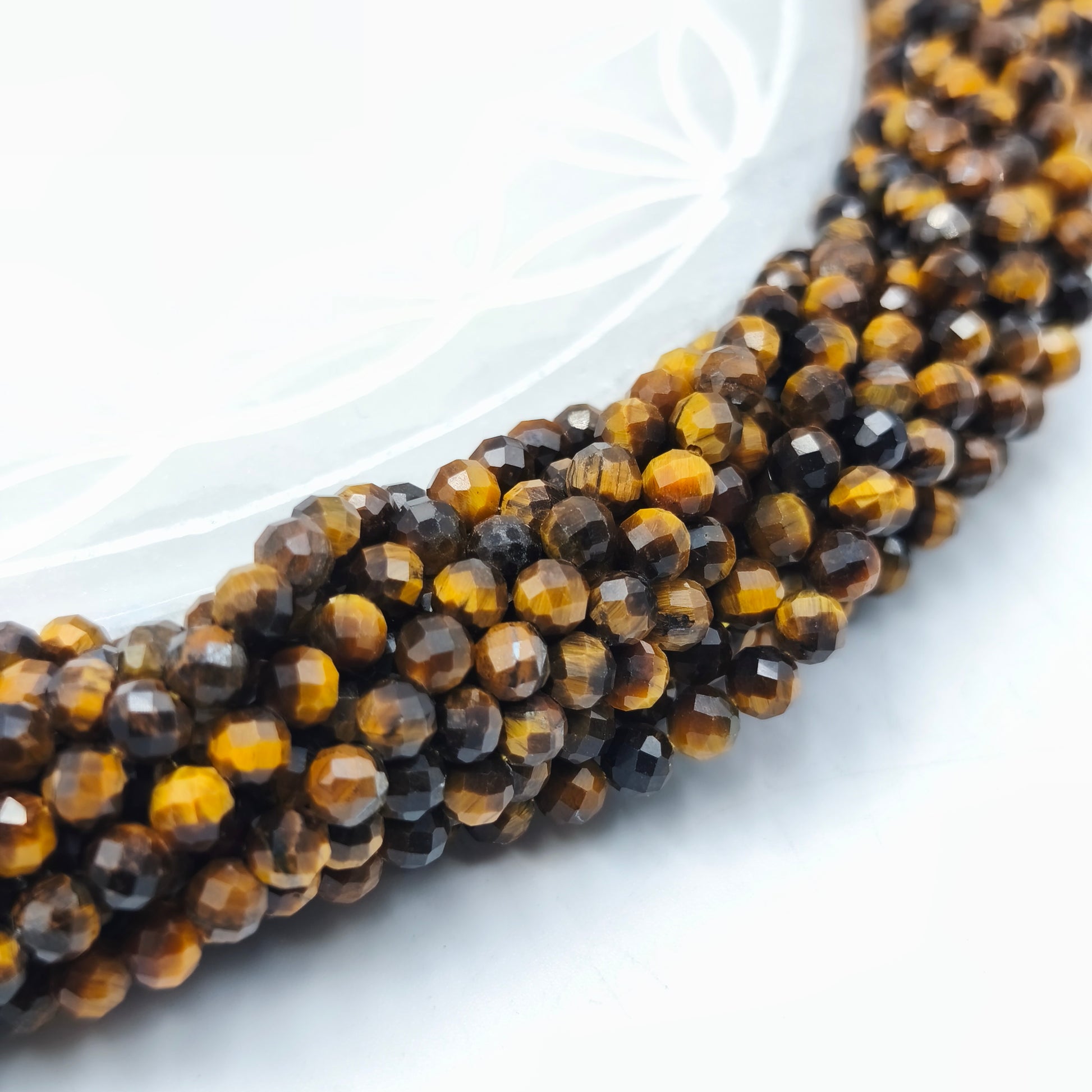 Les variations naturelles de facettage, de teinte et d’intensité des reflets sont inhérentes à l’œil de tigre et garantissent l’authenticité du produit. Chaque rang est préparé avec soin afin d’assurer une cohérence visuelle et une qualité conforme aux standards professionnels de Minéraux d’Ailleurs.