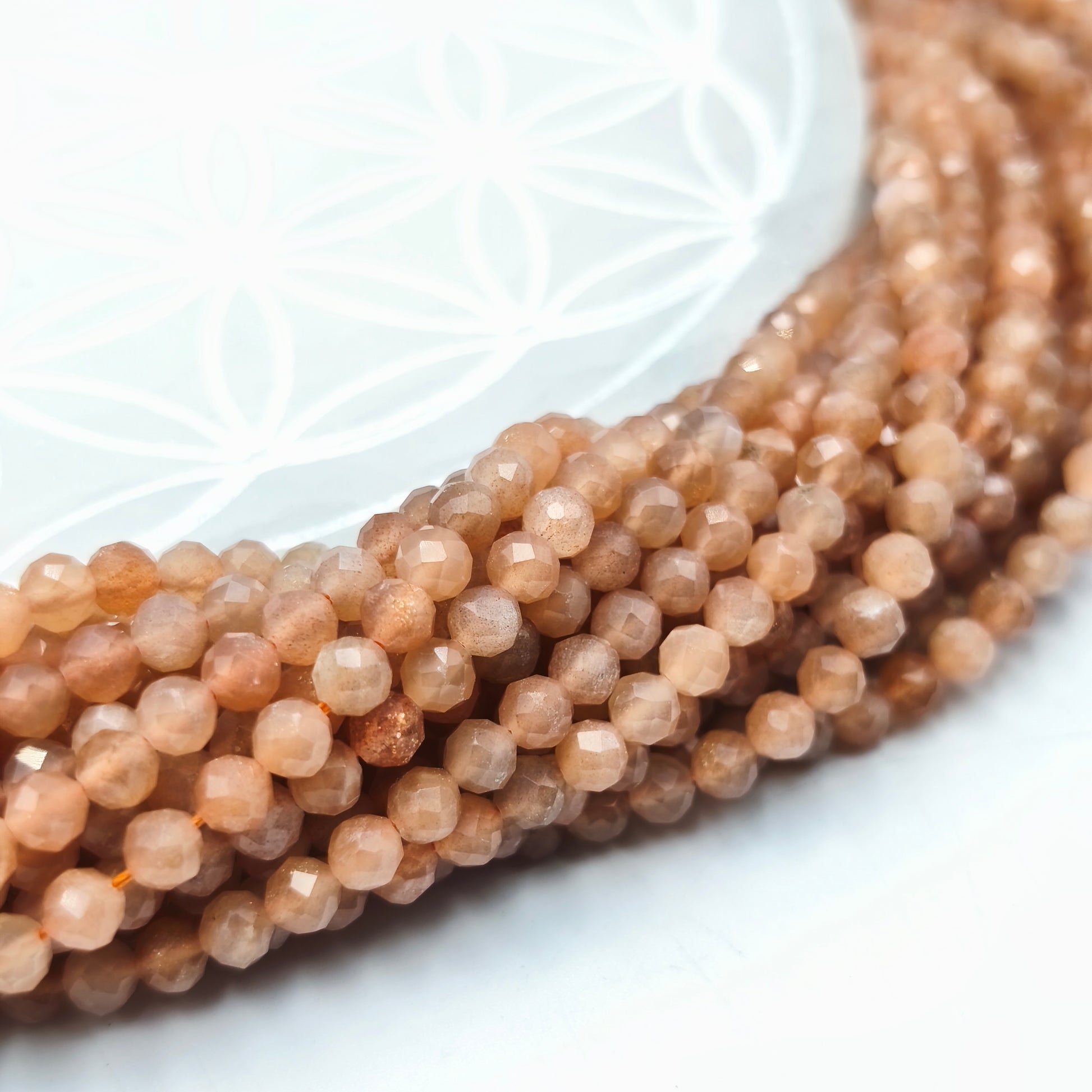 Ce rang de pierre de soleil facettée 4 mm proposé par Minéraux d’Ailleurs présente des perles aux teintes chaudes, allant de l’orangé à des nuances cuivrées, parfois ponctuées de reflets scintillants visibles selon l’angle et la lumière. La taille facettée apporte un éclat supplémentaire en captant la lumière, offrant un rendu visuel lumineux et dynamique. Chaque perle est sélectionnée avec soin afin d’assurer une texture agréable, une bonne régularité et une présentation qualitative, répondant aux exigences des professionnels de la bijouterie et de la création.
